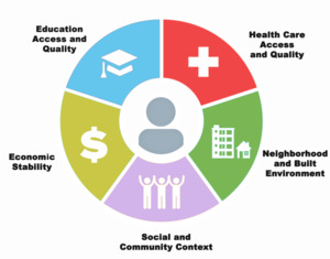 Social Determinants of Health (SDOH) encompass a broad range of social, economic, and environmental conditions that shape individual and community health outcomes (Healthy People, 2030; McGinley et al., 2023; World Health Organization [WHO], 2023). This overarching framework encompasses five domains: Economic stability, access to and quality of education, access to and quality of healthcare, neighborhood and built environment, and social and community context (Healthy People, 2030; McGinley et al., 2023; WHO, 2023). The economic stability domain includes factors such as income, employment, poverty, and food insecurity (Healthy People, 2030). The education access and quality domain includes factors such as level of education, access to quality education, and early childhood education (Healthy People, 2030). The healthcare access and quality domain includes factors such as availability, accessibility, and affordability of health insurance, access to healthcare providers, and quality of care (Healthy People, 2030). The neighborhood and built environment domain includes factors such as housing quality, environmental quality, access to healthy food, transportation, and neighborhood crime rates (Healthy People, 2030). The final domain, social and community context, includes factors like social support, community cohesion, familial structure, and civic engagement (Healthy People, 2030). Together, these domains provide a comprehensive lens for understanding how non-medical factors contribute to disparities in health, well-being, and opportunity. While traditionally emphasized in public health, the SDOH framework has critical relevance for human services professionals, whose work is embedded in the very systems that shape these social conditions (Robins et al., 2021).