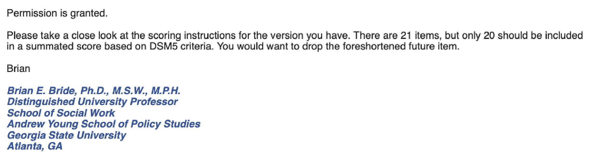 Life Scale (ProQOL; Stamm, 2009), and the Impact of Event Scale–Revised (IES-R; Weiss & Marmar, 1997), were considered but ultimately not selected because they either predated DSM-5 revisions, measured broader constructs such as compassion fatigue, or were not specific to STS. Consequently, study findings should be viewed as preliminary and hypothesis-generating, warranting replication with validated measures as they become available.